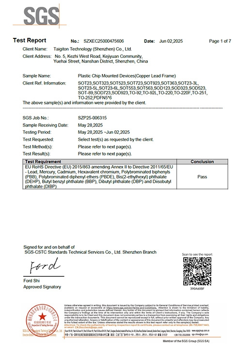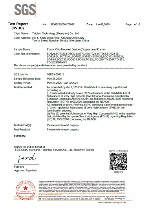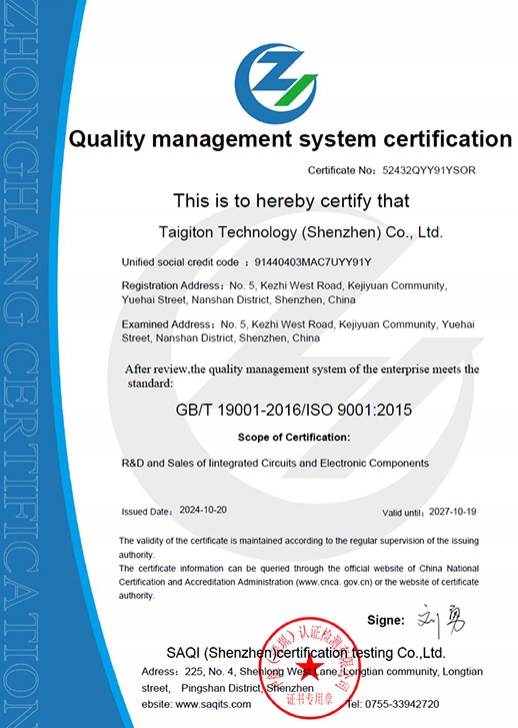 Taigiton Semiconductor is a high-tech enterprise specializing in the design, R&D, production, and sales of semiconductor devices. The company has introduced advanced automated production lines and testing equipment from Switzerland, Japan, Singapore, Hong Kong, and other countries and regions, laying a solid foundation for producing high-quality and high-performance products. It manufactures a wide range of semiconductor discrete devices and IC products in various package forms, including TVS/ESD protection diodes, diodes, transistors, rectifiers, power MOSFETs, three-terminal voltage regulators, and other full-series products. These products are widely used in various fields such as new energy, industrial control, smart homes, wearables, drones, consumer electronics, communications, medical devices, lighting, security, and instrumentation, serving over 40 countries and regions worldwide. Supported by chip design and R&D manufacturing, the company has built a complete industry chain encompassing product design, R&D, packaging and testing, and sales services. It boasts an experienced and professionally structured technology management team, providing tailored solutions and collaborative R&D services to customers. Production is strictly organized in accordance with the ISO9001, TS16949 quality management systems, and ISO14000 environmental management system. The products comply with EU directives (ROHS), and halogen-free products can be provided to meet customer requirements. Adhering to the philosophy of "Integrity, Diligence, Perseverance, and Optimism," the company continuously enhances its competitiveness and delivers standardized, professional, and comprehensive high-quality services to its clients.